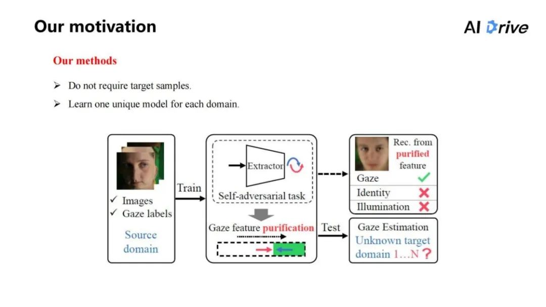 所以,本文的主要想法就是视线特征的纯化。这需要把跟视线相关的特征保留下来,同时把无关的特征去除,这样得到的视线相关特征是比较好实现的,能够在每个域上面都得到使用。