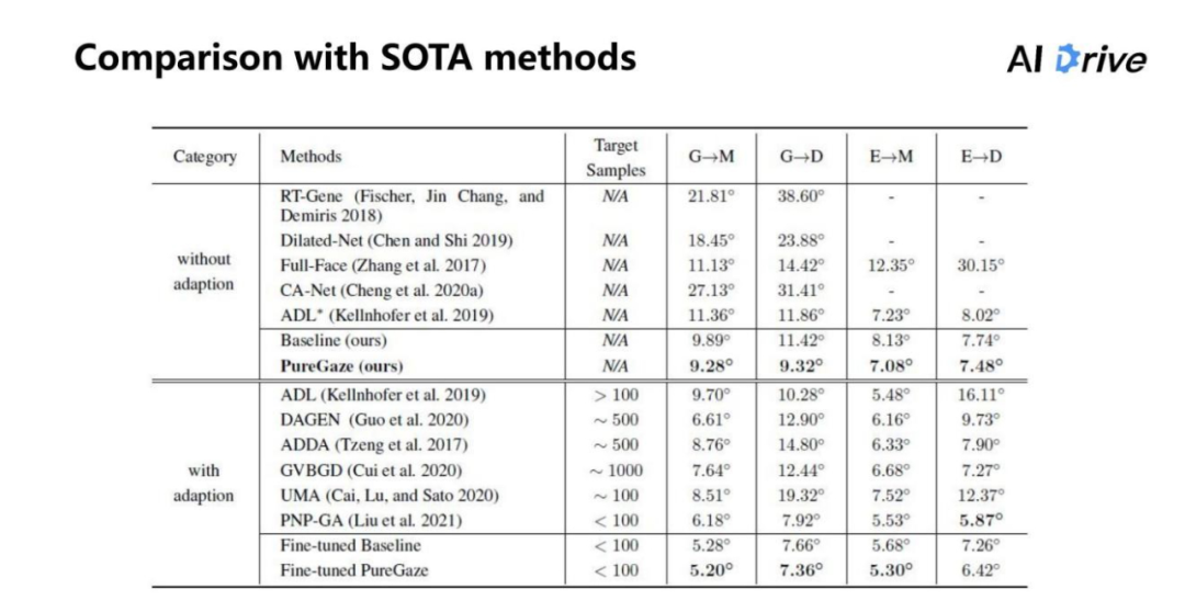 可以看到,在不使用 adaption 的情况下,对于在 Baseline 上每个数据都是有提升的。其中,G 其实是 Gaze360 数据集;M 相当于是 MPII Gaze 数据集;G→M 表示在 Gaze360 上进行训练,同时在 MPII 上测试;D 是 EyeDiap 数据集;E 是 ETH-XGaze。需要注意的是,在 G→M、G→D 这两个任务,其实只训练了一个模型,就是在 Gaze360 上面训练了同一个模型进行测试,虽然分了两栏表示,但是总体来说它只是一个模型。