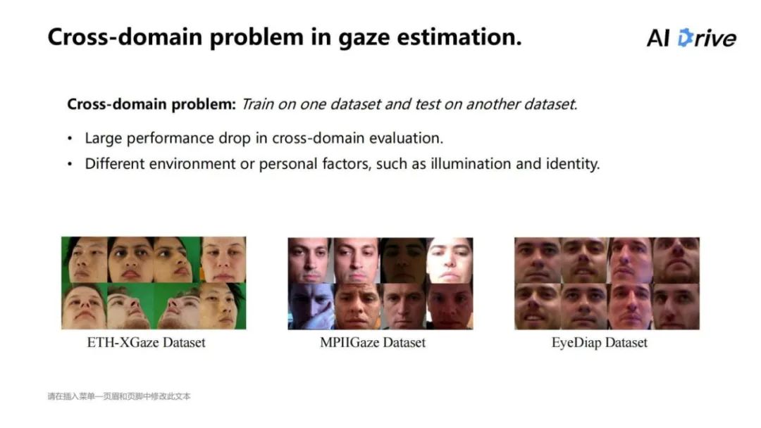 在本工作里,主要解决的是视线估计中的 Cross-domain 的问题。Cross-domain 就相当于把方法放在一个数据集上进行训练,同时在其他的数据集上进行测试,这样就相当于在实际之间的应用,并通过此获得一个通用的算法。