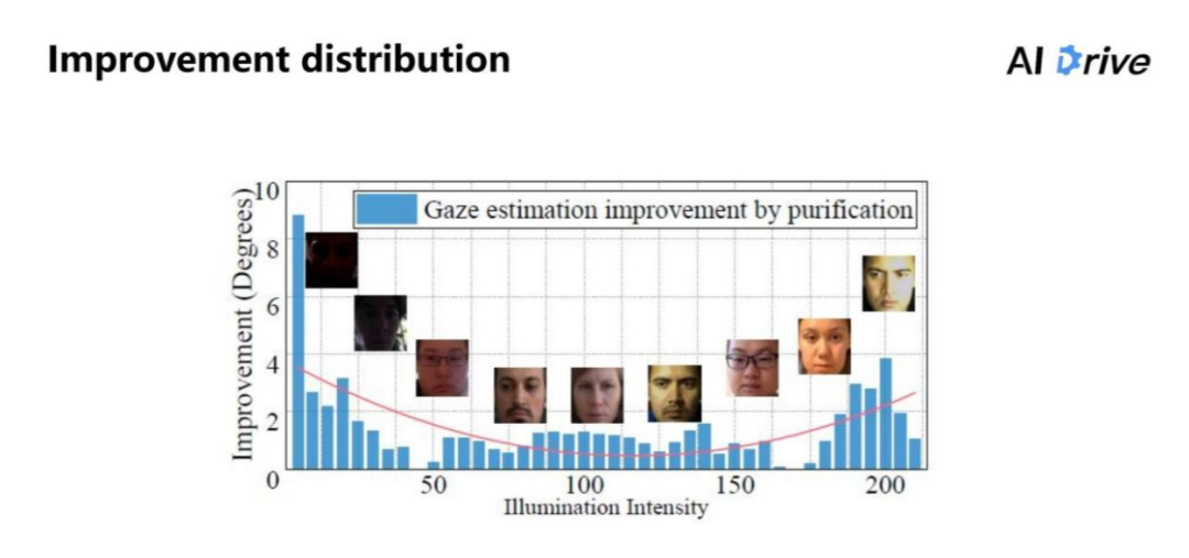 上图是进行具体测试的结果。把 PureGaze 和 Baseline 两个方法在每个光照强度上进行测试,把纯化特征带来的提升把它可视化出来。