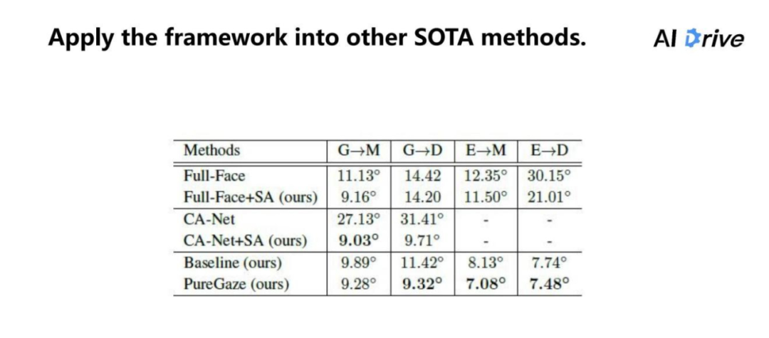对于这两个任务来说,视线估计的网络是并没有做明确要求的,我们把 Baseline 换成了在实现估计任务里的一些通用的算术方法,我们的网络结构直接应用到其他的方法上,也能达到比较好的效果提升。