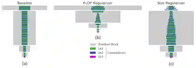 有针对性的正则化:与其他稀疏的正则化方法相比,MorphNet 采取的正则化方法目的性更强。尤其是,MorphNet 方法进行更好的稀疏化的目的是减少特定的资源。这可以更好地控制由 MorphNet 生成的网络结构,根据应用领域和相关约束,MorphNet 可以有明显的不同。例如,下图的左侧面板显示了一个基线网络,该网络具有在 JFT 上训练的常用 ResNet-101 体系结构。当以触发器(中间图,触发器减少 40%)或模型大小(右图,权重减少 43%)为目标时,MorphNet 生成的结构有很大不同。在优化计算成本时,较低层网络中的高分辨率神经元比低分辨率神经元更容易受到修剪。当模型尺寸较小时,在修剪权衡上正好相反。