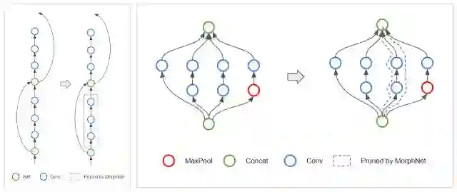 左图:MorphNet 可以删除 ResNet 样式网络中的残差连接。右图:它还可以删除 Inception 样式的网络中的平行塔。