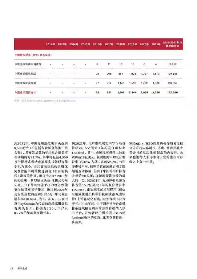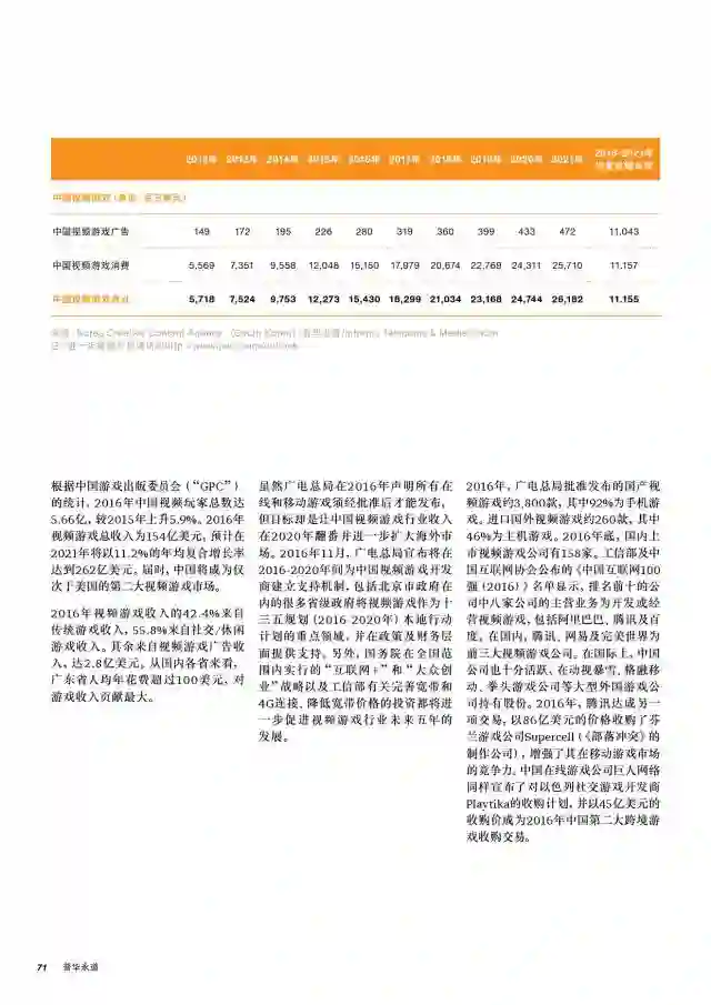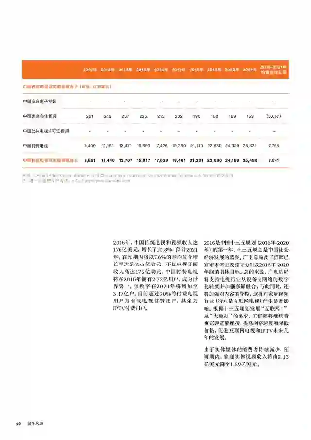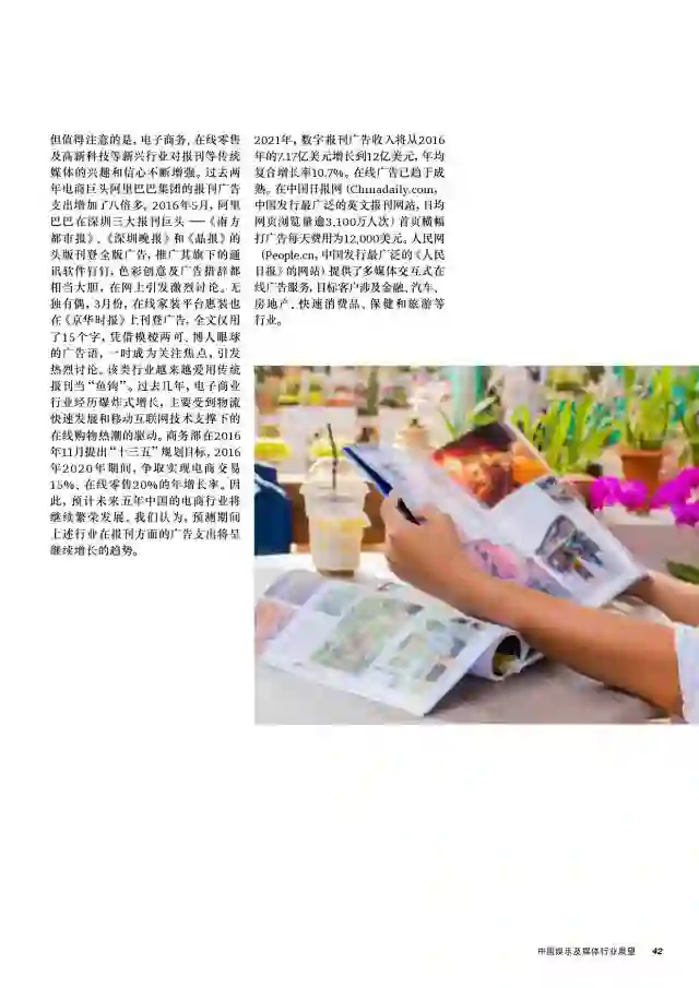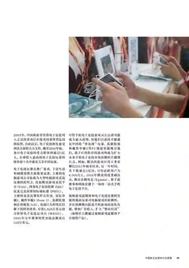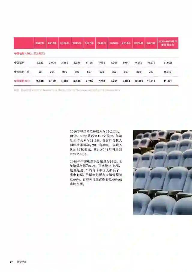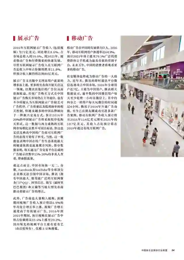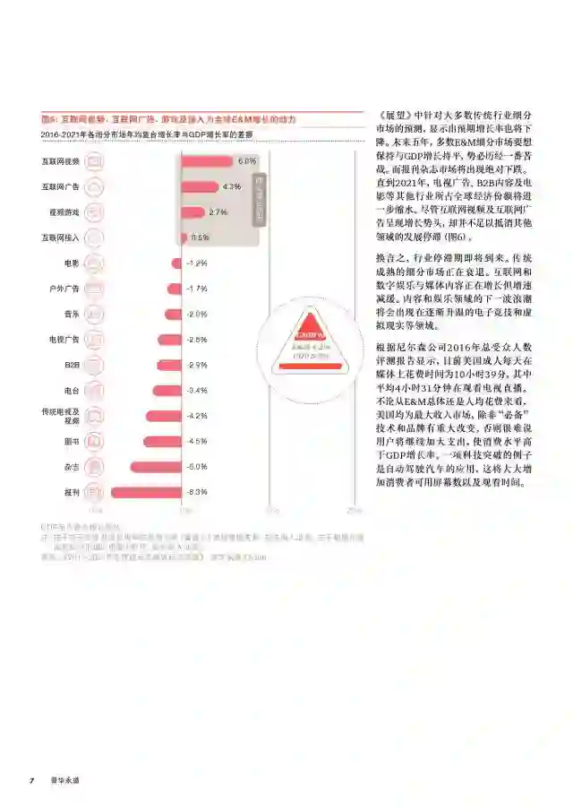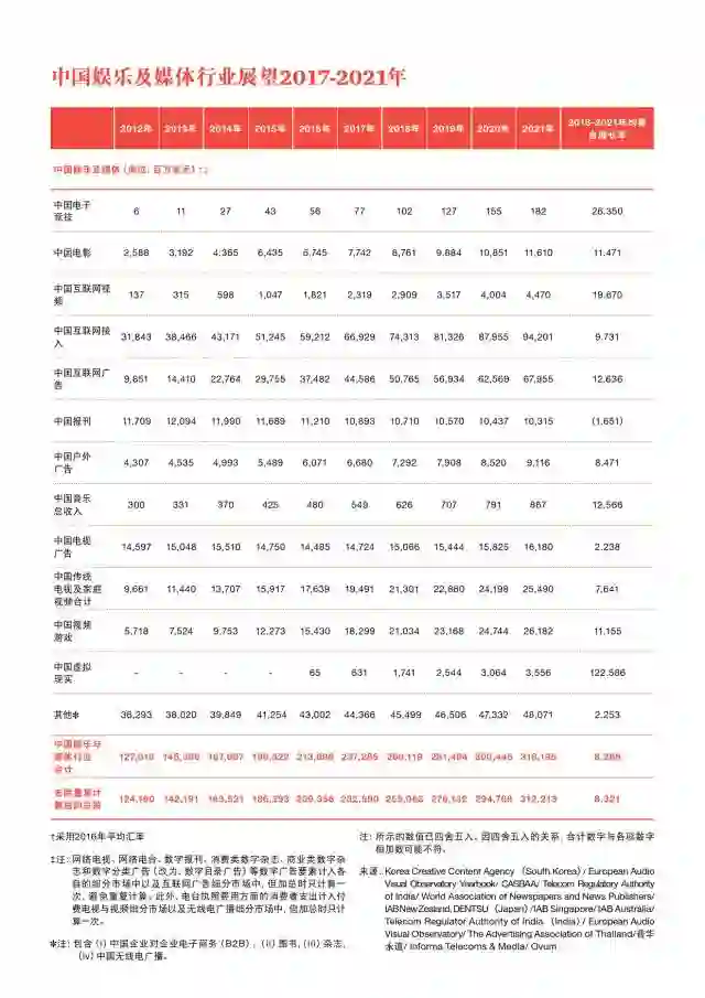 纵观中国娱乐及媒体市场,互联网视频、互联网广告、电子竞技、音乐、电影和视频游戏这几个领域的发展动力强劲,预计其2016-2021年的年均复合增长率分别为19.7%、12.6%、26.4%、12.6%、11.5%和11.2%。