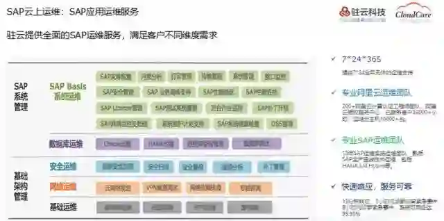 当前IBM、埃森哲、汉得等SAP实施方在帮助客户实施新的SAP S/4HANA时,往往会推荐选择国内最成熟的IaaS平台阿里云。在实施方进场部署SAP之前,企业通常需要全面规划其在阿里云上的专有网络与线下数据中心的规划与对接。驻云发挥阿里云生态第一优势,基于阿里云最佳实践提供专业指导,提供了第一个CloudCare SAP上云交付钥匙服务包,帮助规划云上环境、部署云上资源、审核SAP实施方的部署方案,并协助测试云上SAP完整数据保护方案,为企业核心系统在云端的长期稳定持续运行保驾护航。