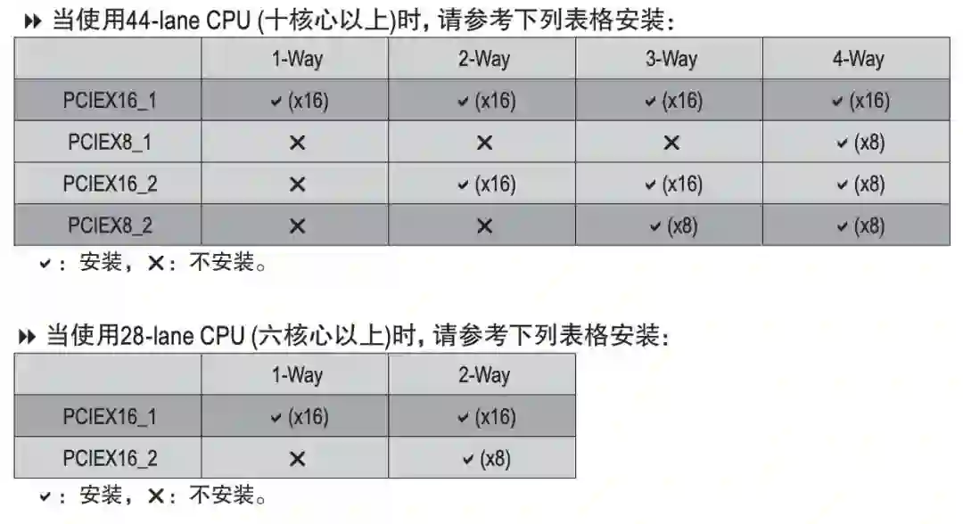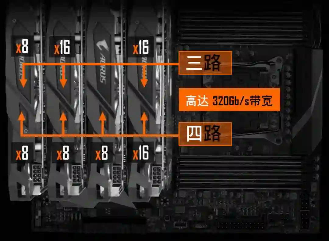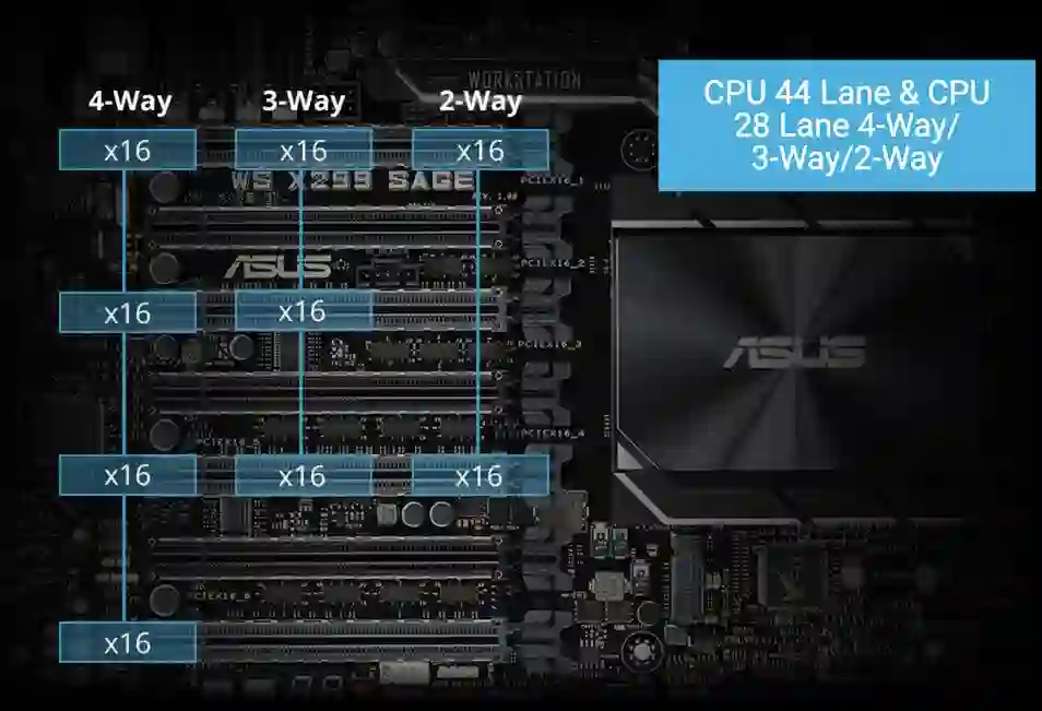 有的主板如 WS X299 SAGE 带有 PLX 桥接芯片,可以在 CPU 没有足够 PCI-E 的情况下达到四卡 x16 的速度: