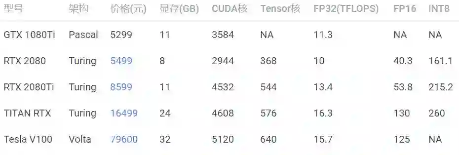 考虑成本可以买 RTX 2080Ti,想要高性能并且高性价比可以买 TITAN RTX,土豪可以选 Tesla V100。