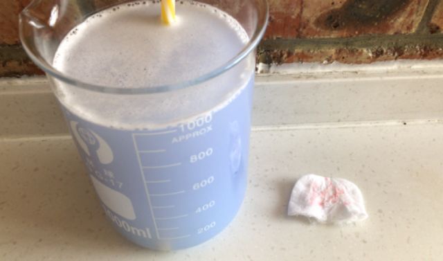 取一颗1号,放1000ml的冷水,浸泡两分钟,用力搅拌三分钟,无果,于是用手搓了一分钟,结果是这样的: