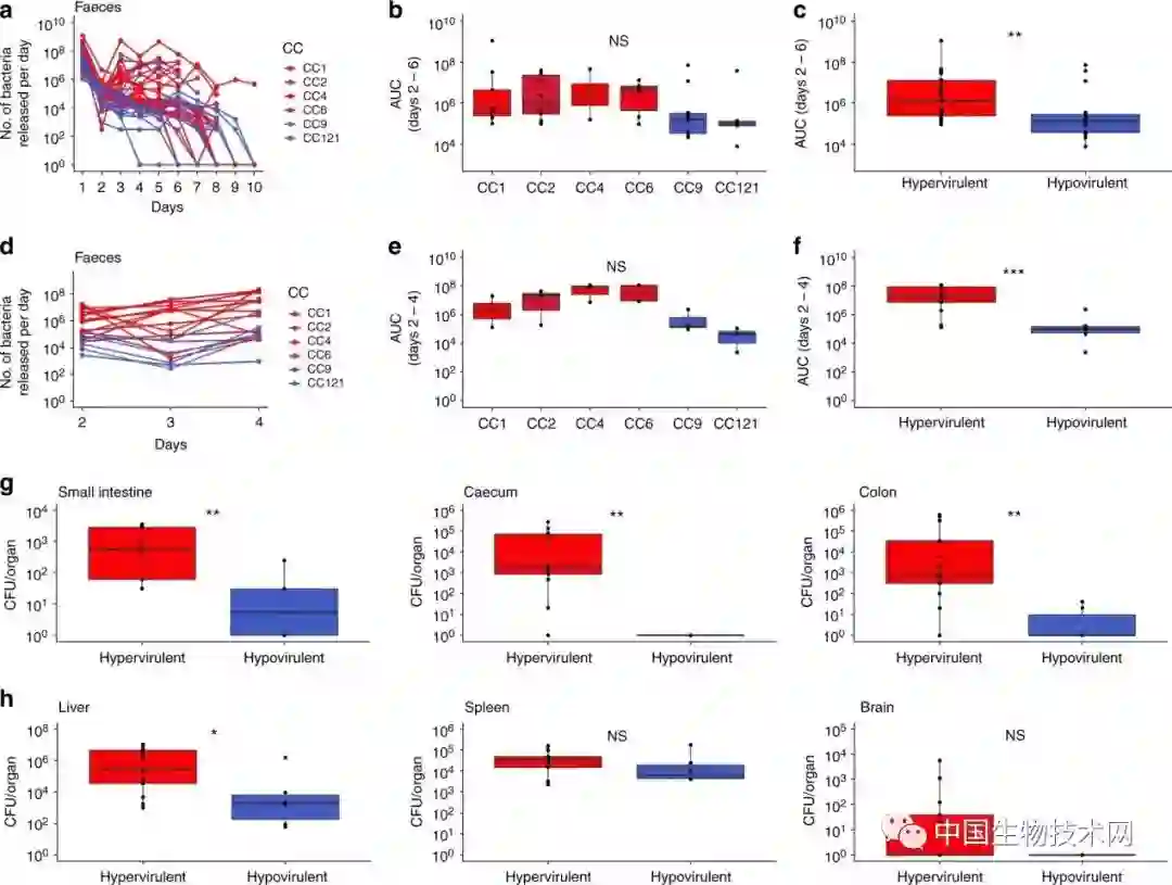4、高毒克隆CC1,CC2,CC4和CC6能更有效地穿过肠屏障,并且一部分细菌可以在肠腔中脱落,带来更高的肠道定植。粪便脱落,在环境中释放Lm,最终有利于菌株在宿主间传播。