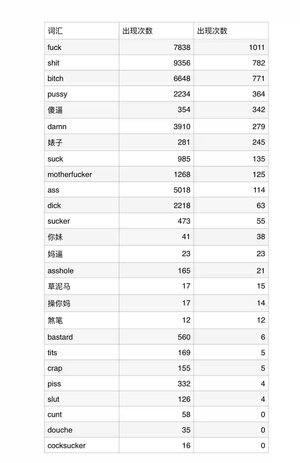 总的来看,我国歌手比较符合社会主义核心价值观。我试着把 “damn” 和 “shit” 这两个不那么“脏”并且口语常见的词在国外的统计中去掉,最后脏话率还有33%,比例远远高于大陆。一个推测是,英文脏话词汇在歌词中更容易押韵,或者唱起来 flow 更好把握。另一个可能是审查原因,早有“in3” 这样的乐队英文歌词原因被禁,国内的 rapper 创作起来可不能太奔放。