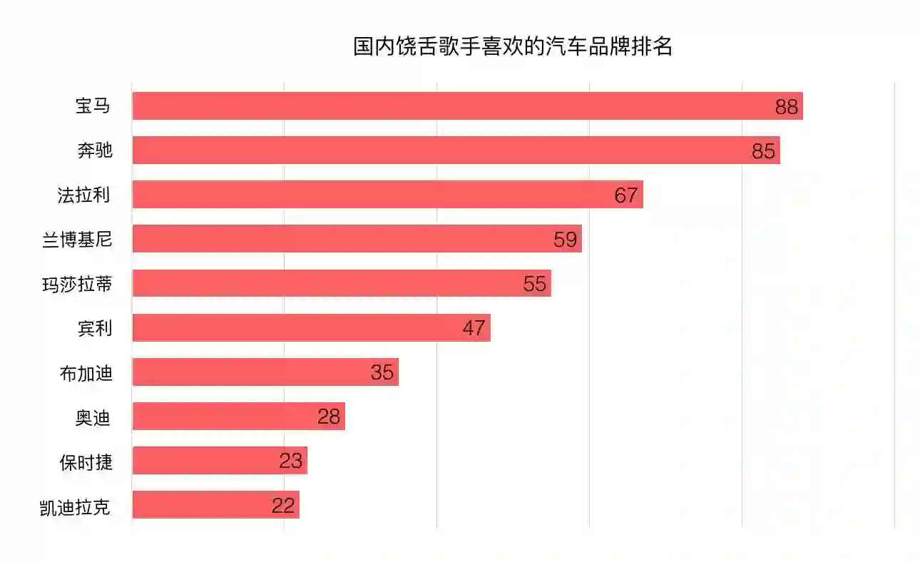 这是各汽车品牌在国内16284首嘻哈歌曲中出现的情况,在一首歌的歌词中出现算一次,总共约有400多首歌中出现至少一次汽车的品牌名字。可以看出,饶舌歌手喜欢宝马和奔驰的很多,特点只有一个,就是贵!其实夏利、桑塔纳等车也有不少歌提到,但一般表达的是消极情绪。