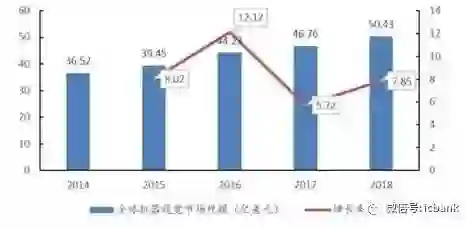 下图是对2014年至2018年全球机器视觉系统及部件机器视觉市场规模预测,图中折线为年增长率,由图根据复合增长率可以计算出2014-2018年的复合增长率为8.39%。