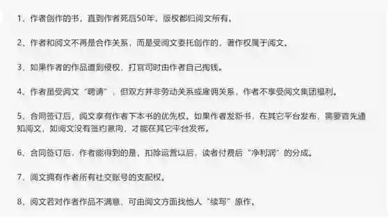 再回过头来看看,究竟阅文霸道在哪?新浪财经针对作者们的控诉和合同条约,总结出了图片所示的几条关注重点: