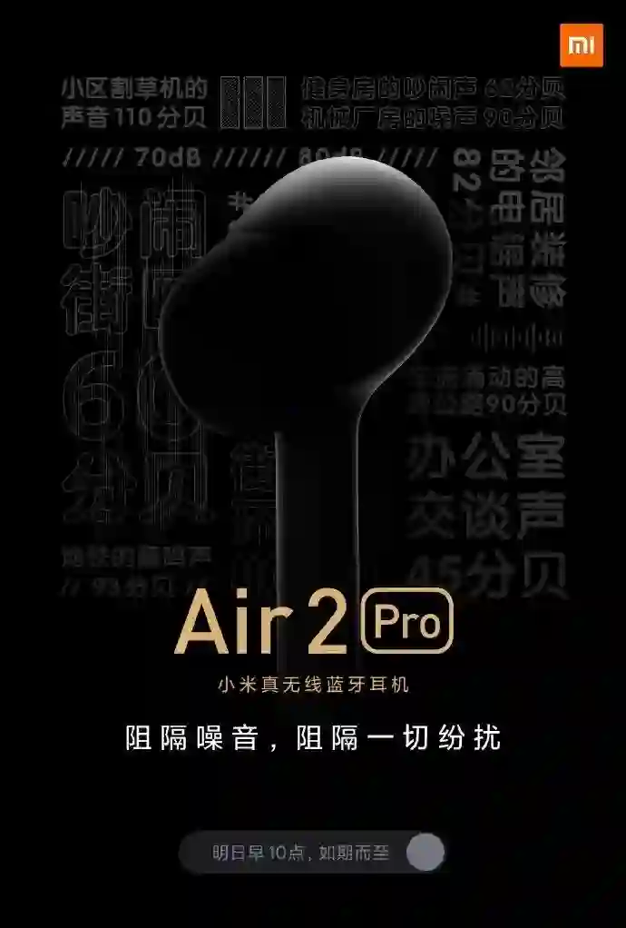 目前各手机厂家都在推进自家的 TWS 耳机,小米今早也通过小米智能生活的微博号,公布了新一代的降噪耳机产品 Air2 Pro,这款耳机将于明早上午 10 点正式发布。
