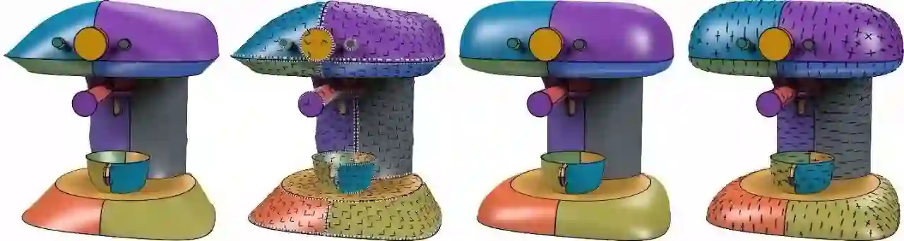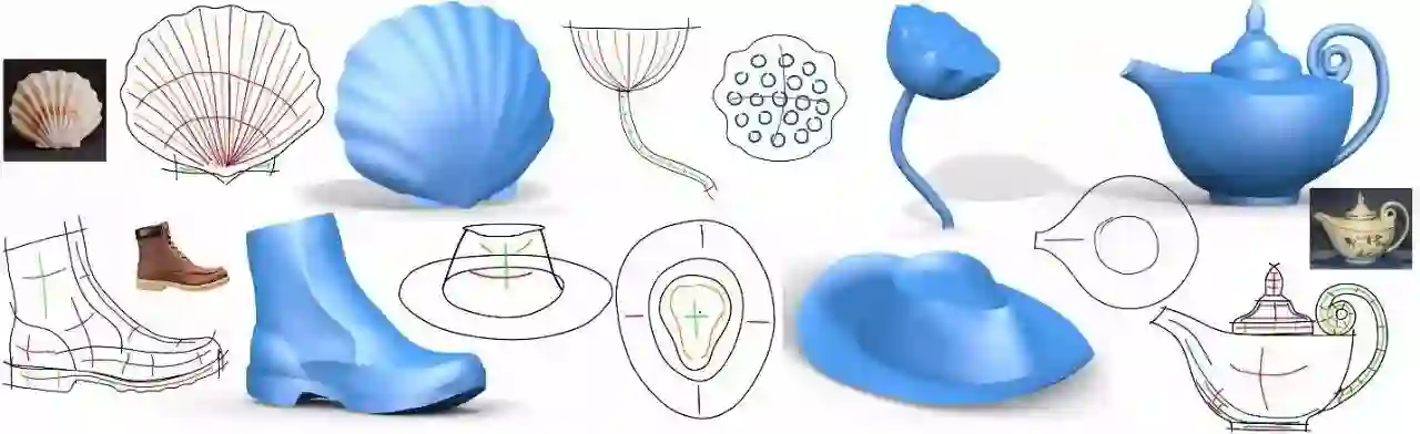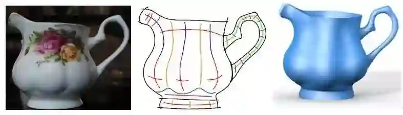 事实上,用户绘制的形状草图中,很多线都是所刻划形状的具有代表性的流线,数学上称之为该形状的主曲率线。如何从这些粗糙近似的主曲率线中恢复曲面,便是我们要解决的核心问题。该核心问题的求解,属于几何处理技术和优化方法的典型应用,因此通过该问题,我们也得以一窥近年来几何处理方向所取得的一些基础的技术进步。