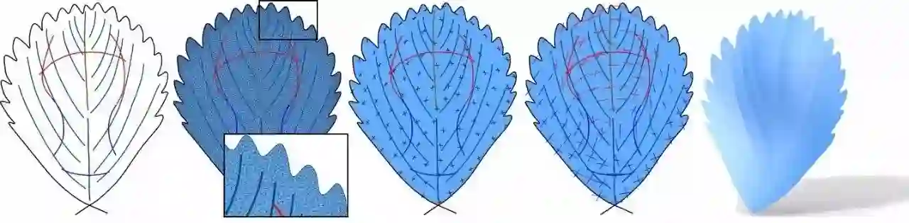 从左至右:输入的平面草图(其中的弯折线被自动标记了曲率正负)、产生覆盖平面区域的网格、构造对齐了弯折线的目标曲率方向场、最终求得的曲率场、和对应的空间曲面