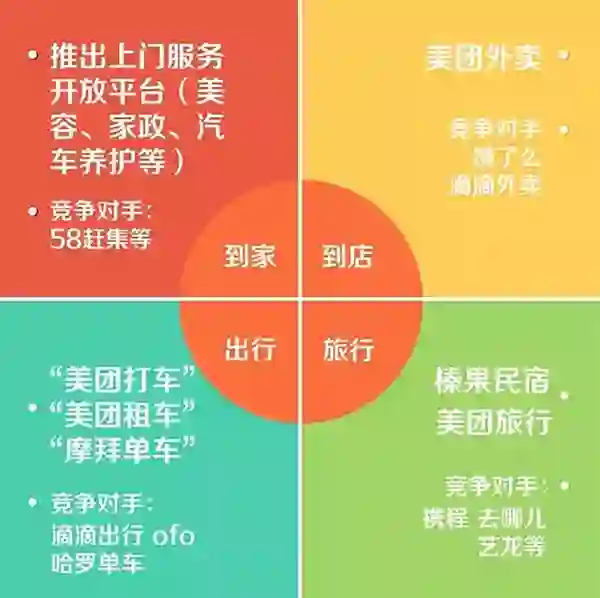 2017年12月,美团点评组织架构调整为四大事业群,即以外卖为核心的大零售事业群,酒店旅行事业群,出行事业群,以及包括传统的团购业务在内的到店事业群。美团的投资方向也开始逐步从外卖、餐饮扩展至酒店旅行、出行和文娱等领域。