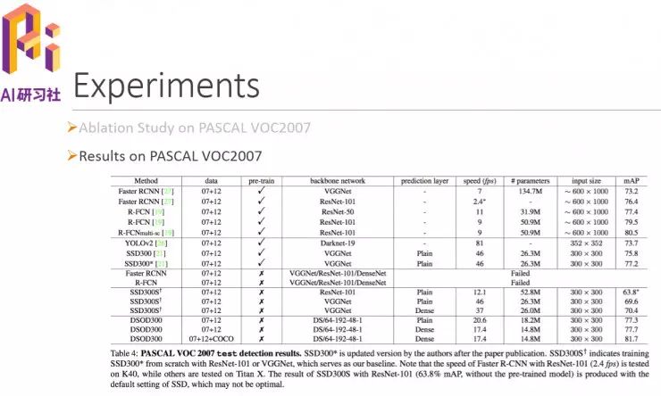 下面是在PASCAL VOC2012上的实验结果,可以看到DSOD有不错的mAP值。