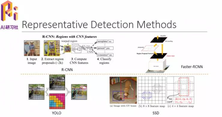 说到目标检测,大家可能会想到如下几个比较有代表性的方法:R-CNN、Faster-RCNN、YOLO、SSD。下图是关于他们的一些介绍。