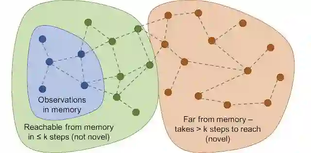借助可达性(Reachability)的情景好奇心:将观测结果添加到记忆中,根据当前观测结果与记忆中最相似的情景之间的差距来计算奖励。当智能体当前看到的情景尚未出现在记忆中时,它会得到更多奖励。