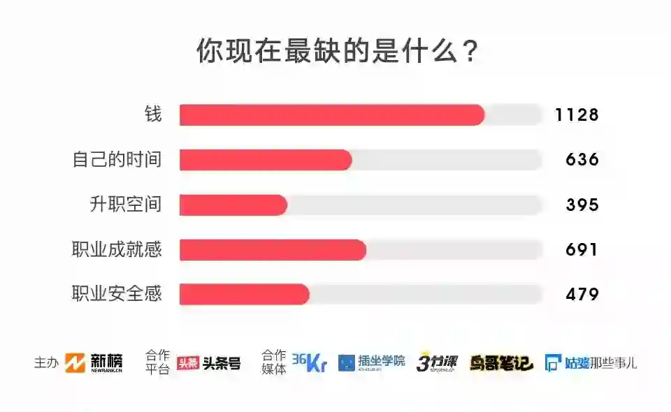 79%新媒体人表示最缺钱,排在第二第三的是职业成就感和自己的时间。