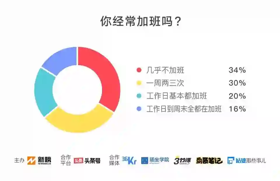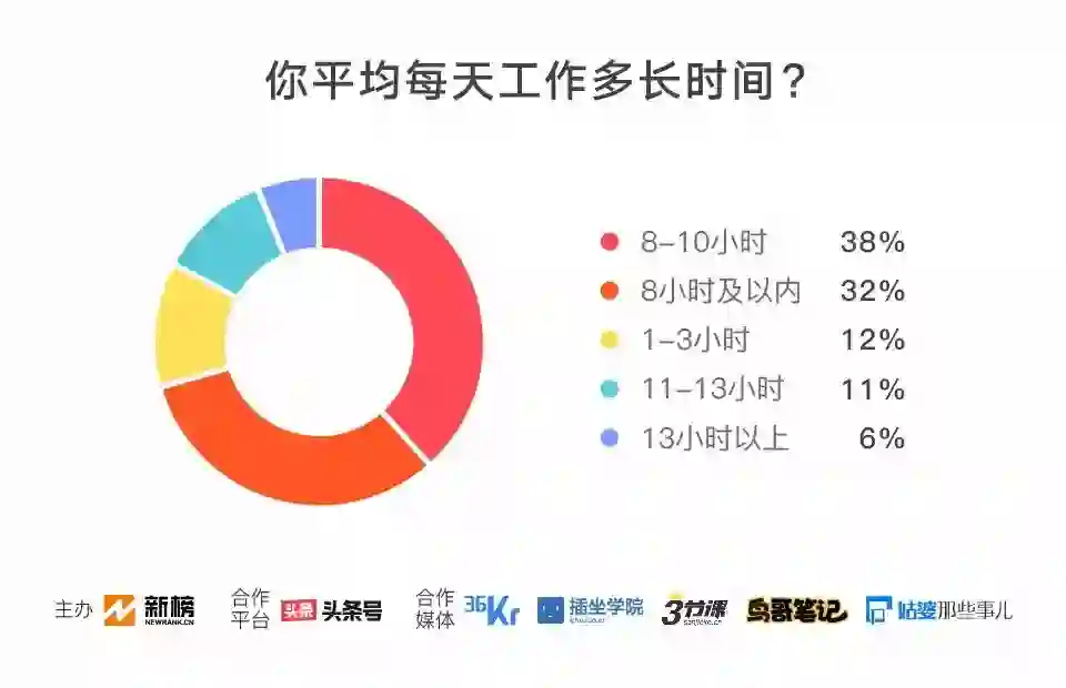 从调查数据来看,每日工作时间在11-13小时甚至13小时以上的有17%;有38%的人工作时间为8-10小时,32%为8小时及以内。