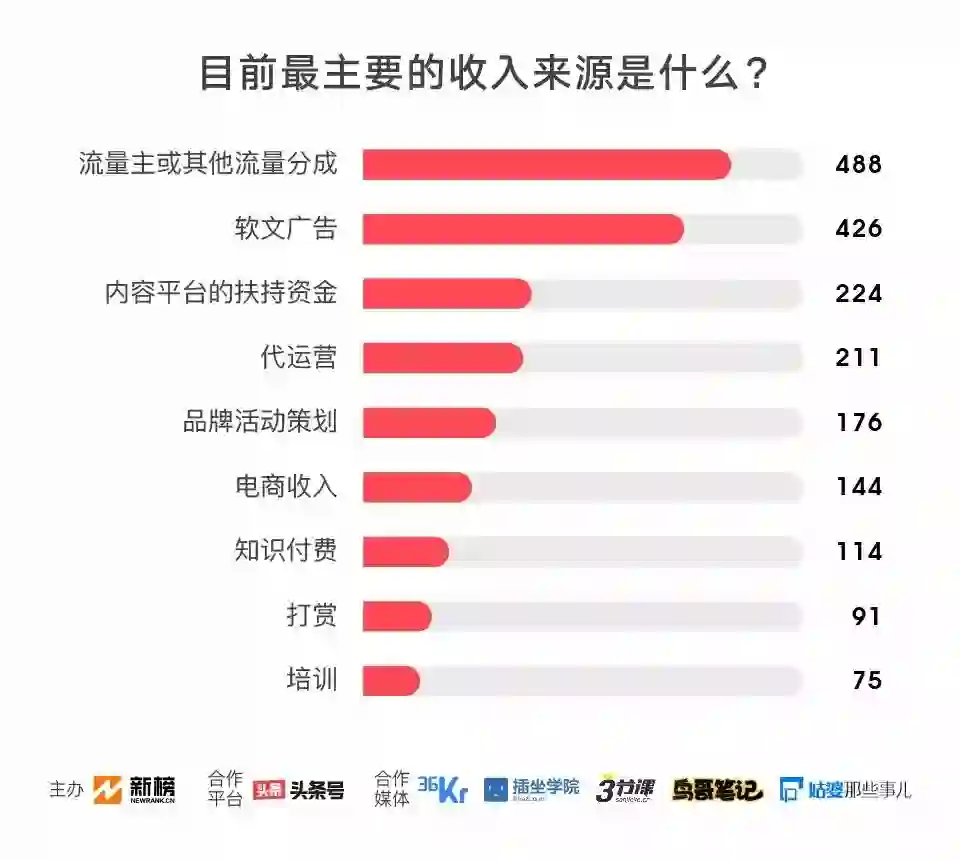 而谈及目前最主要的收入来源,被提及最多的是“流量主或其他流量分成”和“软文广告”,其次是内容平台的扶持资金和代运营费用。