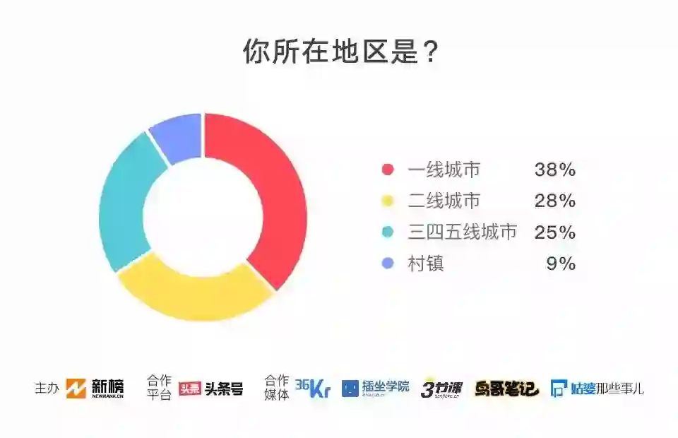 不同于去年的“三四线城市分布人数最多”,今年的调查数据显示,分布在一线城市的新媒体人最多,占38%,其次是二线城市、三四五线城市,村镇占9%。