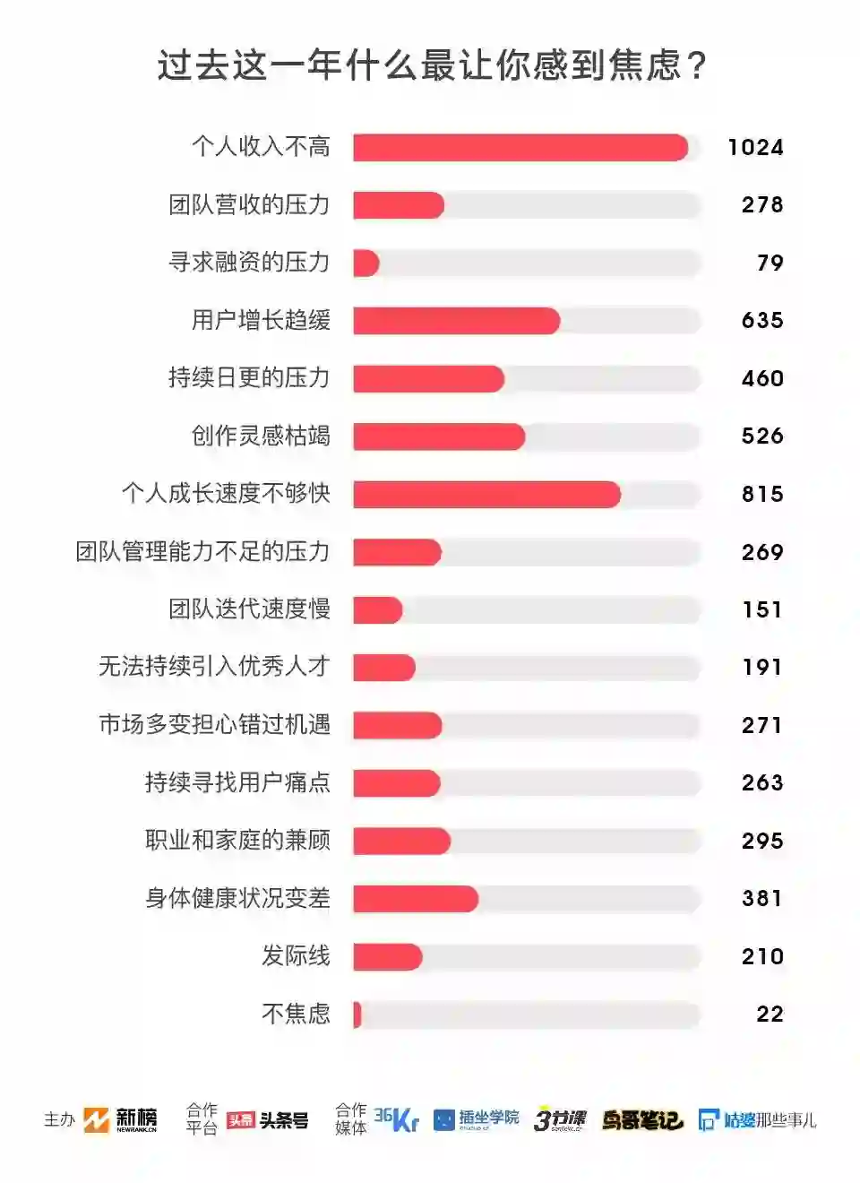 最让奋斗在新媒体一线的白领焦虑的是:个人收入不高、个人成长速度不够快和创作能力枯竭。同时,用户增长趋缓、身体健康状况以及发际线也被排在比较靠前的位置。