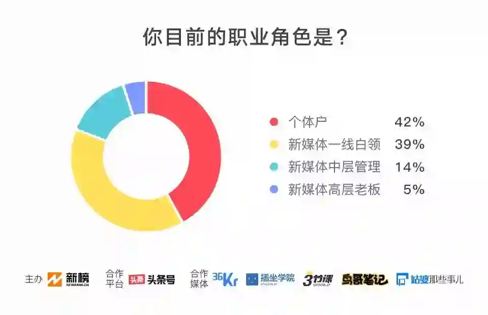 参与问卷调查的新媒体人中,有42%是个体户,也就是我们常说的个人自媒体。有39%为奋斗在创作一线的新媒体白领,我们常说的新媒体小编也在此列。其余是新媒体中高层管理者。