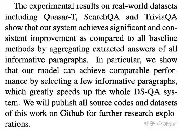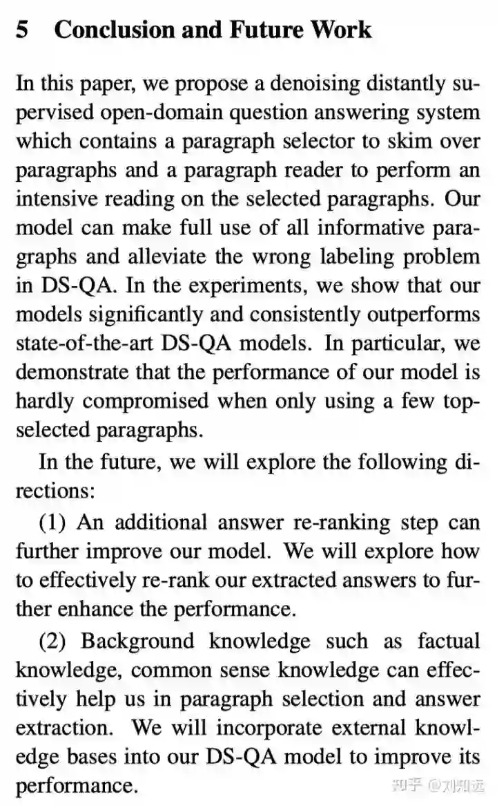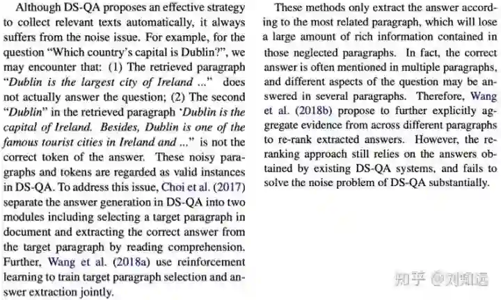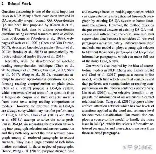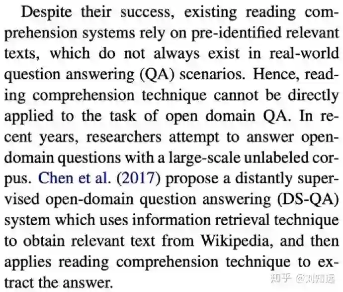 从研究任务递进一步,介绍这个任务的已有代表方法。如下所示论文 [2] 的第 2 段,开始介绍 DS-QA。需要注意,这个已有方法需要是目前最好、最具代表性的,也是本文工作准备改进的。所谓站在巨人的肩膀上,一篇值得发表的论文需要找到那个最高的巨人。