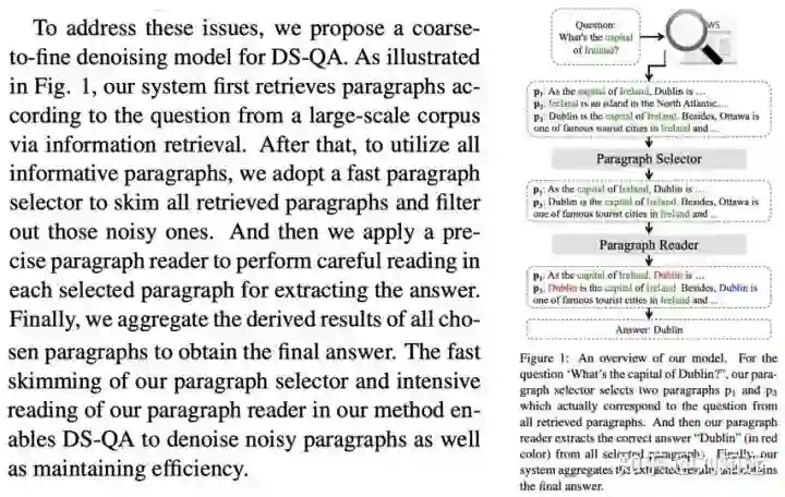 如下所示论文 [2] 的第 5 段,就是介绍创新思路和方法。可以看到,一般"面临挑战"和"创新思路"部分还配图示,更直观地展示本文要解决的挑战问题和创新思路。例如论文 [2] 这张丑丑的图,比较直观地展示了创新方法包括 Selector 和 Reader 两个模块和作用。也可以随便看我们的其他论文 [3],大部分论文都会在 Introduction 中提供图示。