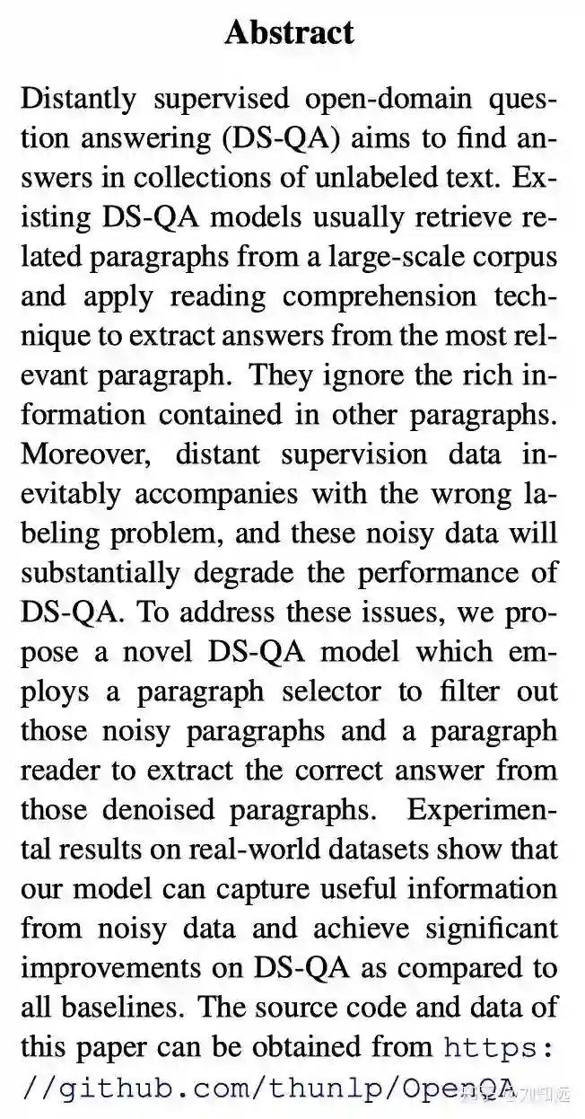 Yankai Lin, Haozhe Ji, Zhiyuan Liu, Maosong Sun. Denoising Distantly Supervised Open-Domain Question Answering. ACL 2018. http://nlp.csai.tsinghua.edu.cn/~lzy/publications/acl2018_qa.pdf