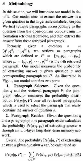 这部分起手"总"的部分要介绍本文任务的符号定义,以及本文方法的框架组成,或者按步骤来介绍或者按模块来写,让读者对本文方法有全景式的理解。如下所示论文 [2] 的 Methodology"总"的部分,就先介绍一些符号,然后分别介绍了 Selector 和 Reader 两个模块的主要功能。