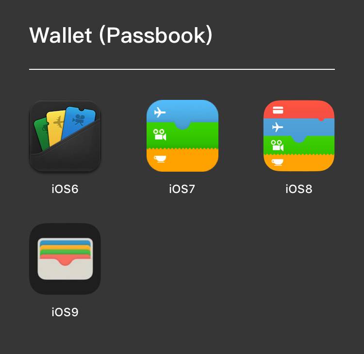 Wallet 的前身是 Passbook,一款票券聚合应用。随着 Apple Pay 的加入,iOS 8 中的 Passbook 图标多出了一个银行卡标识。在 iOS 9 中正式进化为 Wallet,图标也修成正果,彻底变成一个钱包。