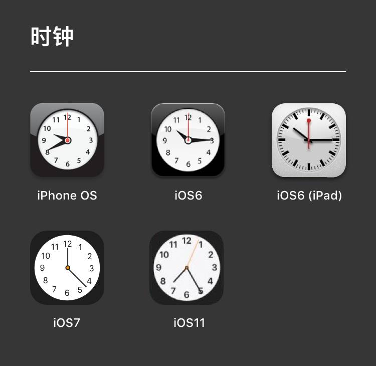 iOS 最土豪图标得主。扁平化之前,时钟图标也经历了一些光线细节调整,其主图案一直没变。但 iOS 6 的 iPad 版本图标绝对是一个异类,这也是时钟应用第一次来到 iPad。其设计照搬了瑞士联邦地铁的钟表设计:
