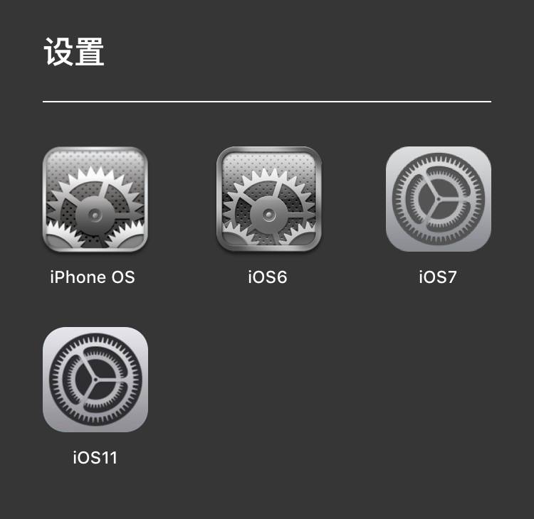 设置图标也经历了光影细节调整,在 iOS 6 中齿轮的齿变得圆润了一些,这也是第一个能在手机升级中转动的齿轮。iOS 7 版本变成了套圈的齿轮,iOS 11 版本的黑色部分更深。
