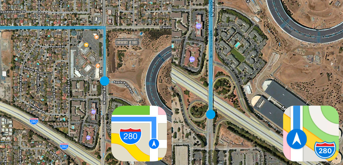 光看图标也不难看出这并不是一个十字路口,出门就翻车,被网友认为是对苹果地图精确度差的最好吐槽。在 iOS 7 版本中,图标直接换成从 Apple Park(新总部)出发,这枚图标在当时暗示了新总部的位置。由于新总部现已落成,iOS 11 版图标直接画出了 Apple Park 的一角。