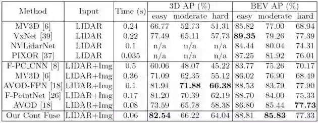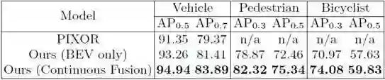 3、在TOR4D数据集上评估多类别BEV目标检测,如表3所示。将连续融合模型与BEV基准以及最近的基于LIDAR检测器的PIXOR进行了比较,其在所有类别上明显优于其他两种基于LIDAR的方法。
