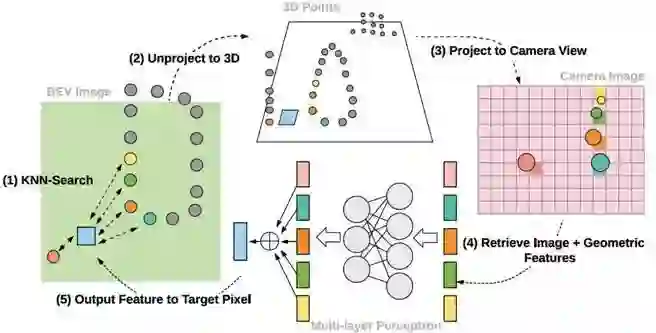 1、 连续融合层:在BEV图像上给定目标像素,首先提取K个最近的LIDAR点。然后将3D点投影到相机平面,检索对应的图像特征。最后将图像特征和连续几何偏移输入到多层感知器(MPL)中,以生成目标像素的特征。整个计算过程如图2所示。