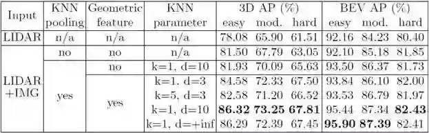 2、连续融合有两个组件,使得图像与LIDAR之间能够稠密精确融合。第一个是KNN polling,它通过稀疏的相邻点来收集稠密BEV像素的图像特征输入。第二个是输入到MLP的几何特征,它补偿两个模态匹配位置对之间的连续偏移。如表2所示,将连续融合模型与仅LIDAR模型(LIDAR输入),稀疏融合模型(无KNN pooling),离散融合模型(无几何特征)进行比较,证明了KNN pooling插值的重要性。