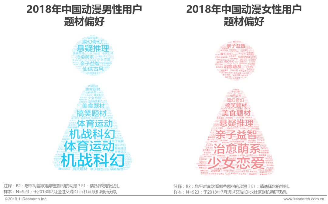 男性偏好机战和体育题材,女性偏好恋爱和萌系题材