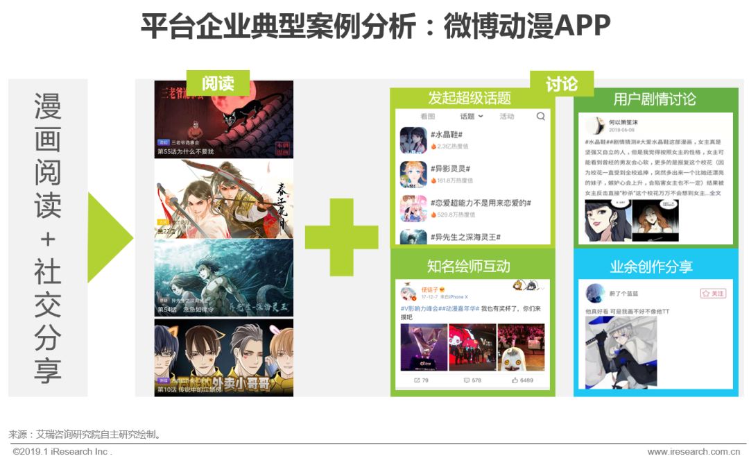 互联网具有极强的外部效应,那些拥有庞大用户数的互联网平台,也就越具有成为“装机必备”应用的潜力。对于漫画阅读平台而言,内容社交将使其具有成为一个集漫画阅读、社交、衍生品分发推广的一站式文化消费平台的可能。根据艾瑞调研显示,动漫用户最常进行的相关活动就是在网上社区讨论动漫剧情解析和进行动漫评价。一方面,用户有内容社交的需求,另一方面,漫画平台只有以内容为核心,衍生出内容社交的需求,才具备开展流量转化业务的可能。以微博动漫为例,微博的动漫领域是微博社交中最为活跃的垂直领域之一,围绕动漫作品的讨论不仅能与内容阅读业务相结合,而且能够依托微博账号搭建IP粉丝的交流沟通平台,在后续IP的内容衍生、广告合作、实物衍生给开发中扮演流量中转站的角色。
