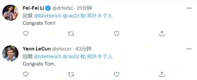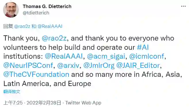 获奖者Dietterich本人很快回复了这条祝贺。他对 Subbarao Kambhampati表示感谢,也感谢了他曾任职的多个AI机构和组织中做出贡献的、来自世界各地的志愿者。