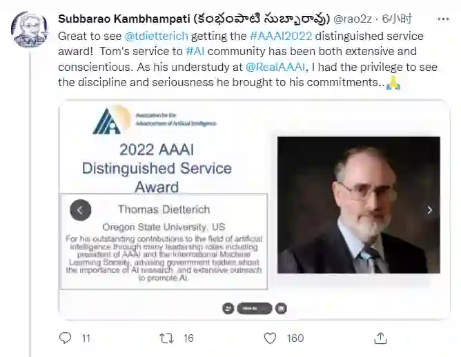 「很高兴Dietterich获得AAAI2022杰出服务奖。