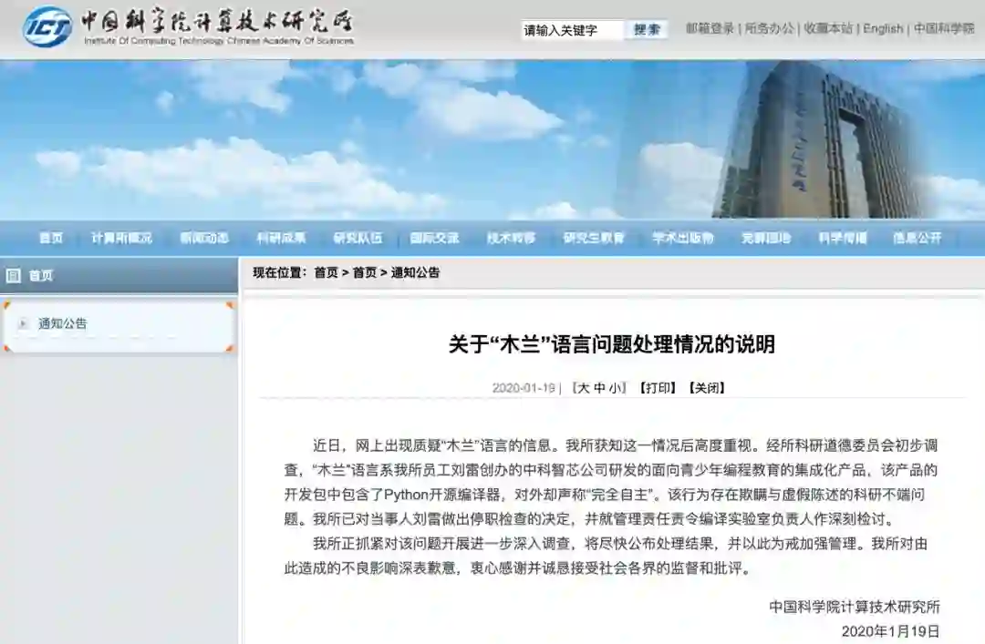 内容提要:1 月 15 日,中科院计算所发布国产编程语言「木兰」,令很多人为之一振,纷纷试用。结果,很快就有开发者质疑它只是「换皮 Python」。面对质疑声,项目负责人刘雷已经发布情况说明,并对自己的夸大行为进行道歉。目前,他已被停职检查。