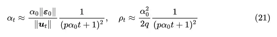 这就是衰减函数的显式解,表明超参数应该按照步数的平方反比衰减,具体代入式 (16) 后得到