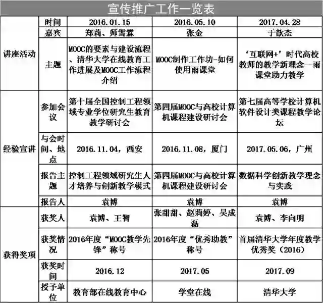 在人员培训方面,我们积极组织人员参加由相关联盟组织的在线教育技术培训,从理论和实践两方面提升业务素质,为后续在线课程建设打下坚实的基础。同时,参与教师和助教取得的奖励颇丰。袁博、王智两位老师获得教育部在线教育中心颁发的2016年度“MOOC教学先锋”称号;张甜甜、赵莉婷、吴成磊三位同学获得学堂在线2016年度“优秀助教”称号;袁博、李向明获得首届清华大学年度教学优秀奖(2016)。