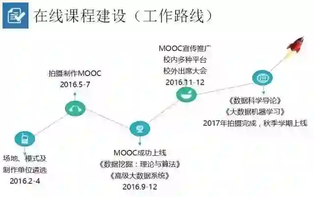 针对异地办学的特殊情况,从2016年初开始,与校本部在线办沟通交流,克服各种困难,在场地、模式和制作单位遴选方面开展了大量工作,利用深研院现有条件,组织制作了两门大数据慕课“数据挖掘:理论与算法”和“高级大数据系统”。近期又有“数据科学导论”和“大数据机器学习”两门大数据慕课建设完成,计划将于2017年11月下旬上线。