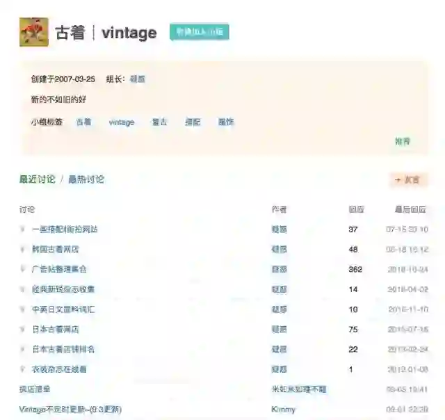 △豆瓣古着小组,一个成立于2007年、直到今天还保持一定活跃度的细分小组。这里既有纯粹的分享帖,也有交易帖。